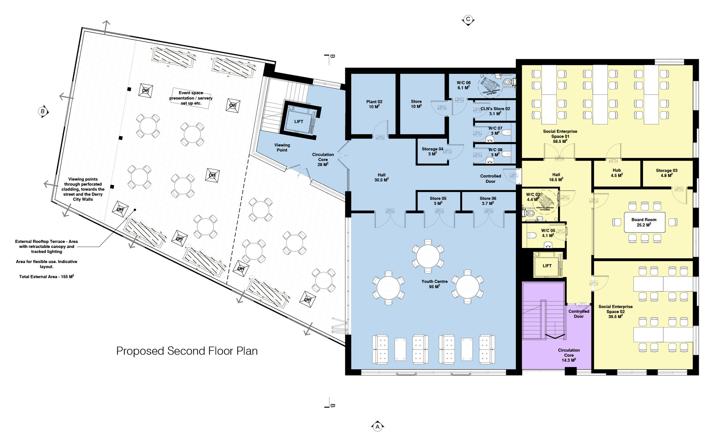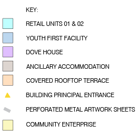 A fully shared and inclusive community hub comprising a wide range of services and facilities for community benefit such as flexible community exhibition/cultural space with provision for hospitality facilities, a welcoming civic square for events and activities, meeting/training rooms for community use, multi-purpose space for sports/events/training for community use, children and youth facilities, and accommodation for a range of experienced organisations providing vital community services, guidance and support.